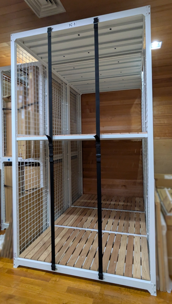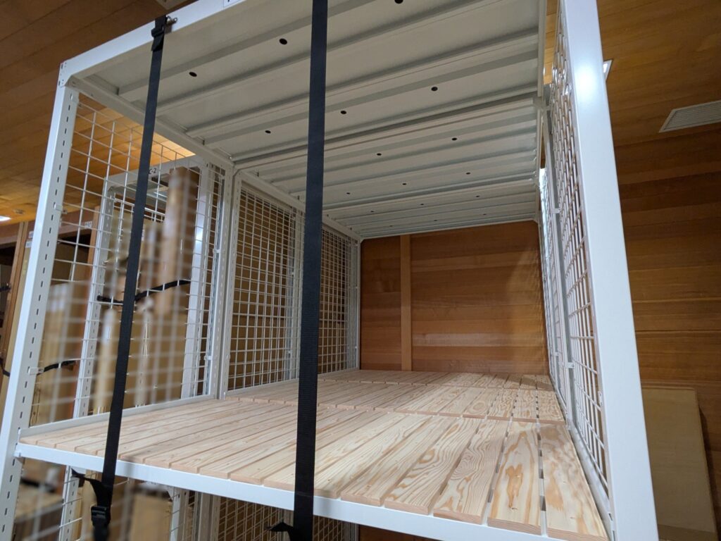 収蔵庫の手前にある「前室」を有効活用するため、天井高ギリギリの高さ3200mmのKMH棚を設置。