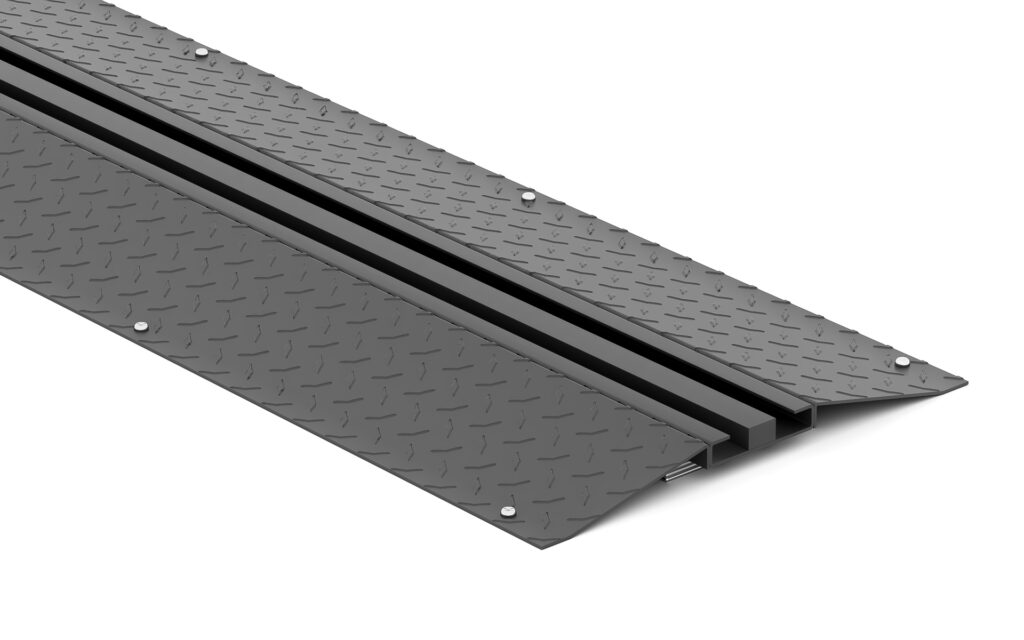 2. Built-up Floor Type Ramps are placed on the approach side only. The space between the rails is filled in (e.g., with plywood) to make the aisle flush. Ideal for trip prevention and cart access.