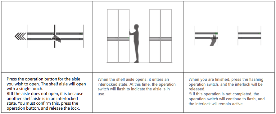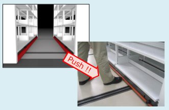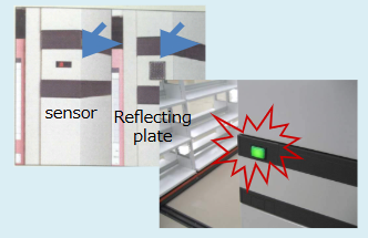 The aisle sensor detects a operator entering and locks the shelving automatically. Leaving the aisle, the operator needs to push the switch for releasing the locking. However with the area sensor system, you do not need to push the switch. After a operator left the passage, it releases the lock automatically.