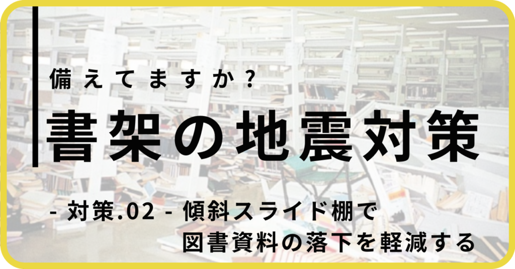 第2弾となる今回は、「– 対策.02 – 傾斜スライド棚で図書資料の落下を軽減する」です。