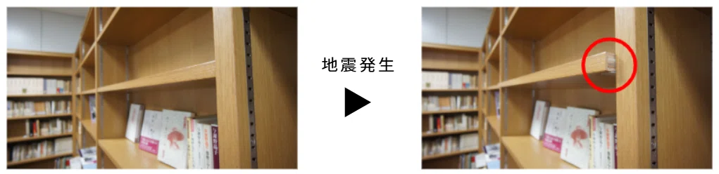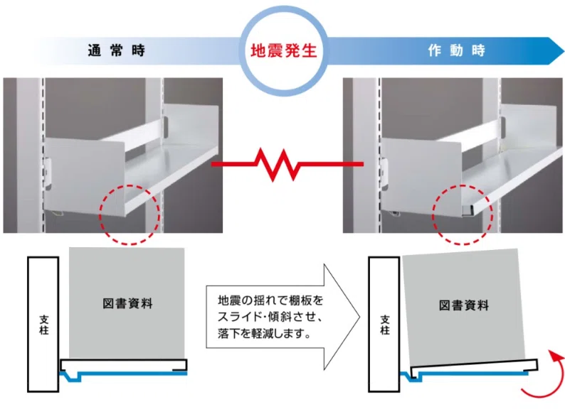 図書の重心が棚奥へと移動することで収納物の落下を軽減させる地震対策用の棚板です。