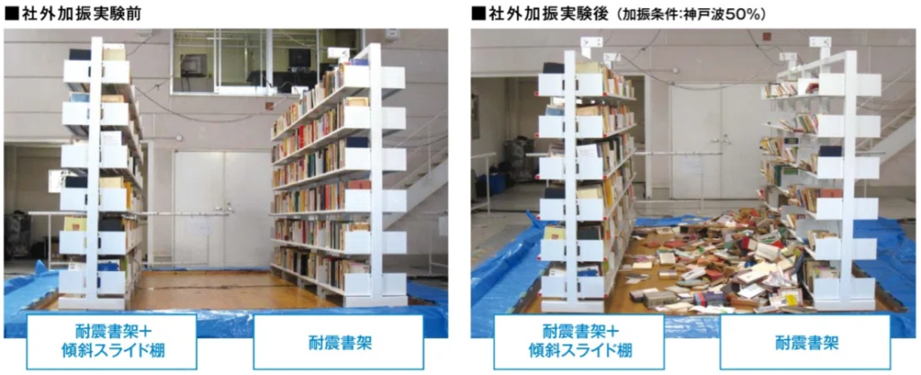 傾斜スライド棚を搭載していない通常棚(右側)は多くの図書資料が落下しているのに比べ、