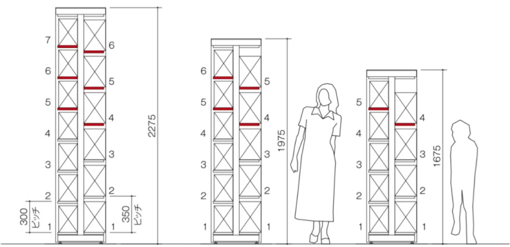 その対策として書架高さ1500mm以上にある棚段を目安に傾斜スライド棚の取り付けをおすすめしています。