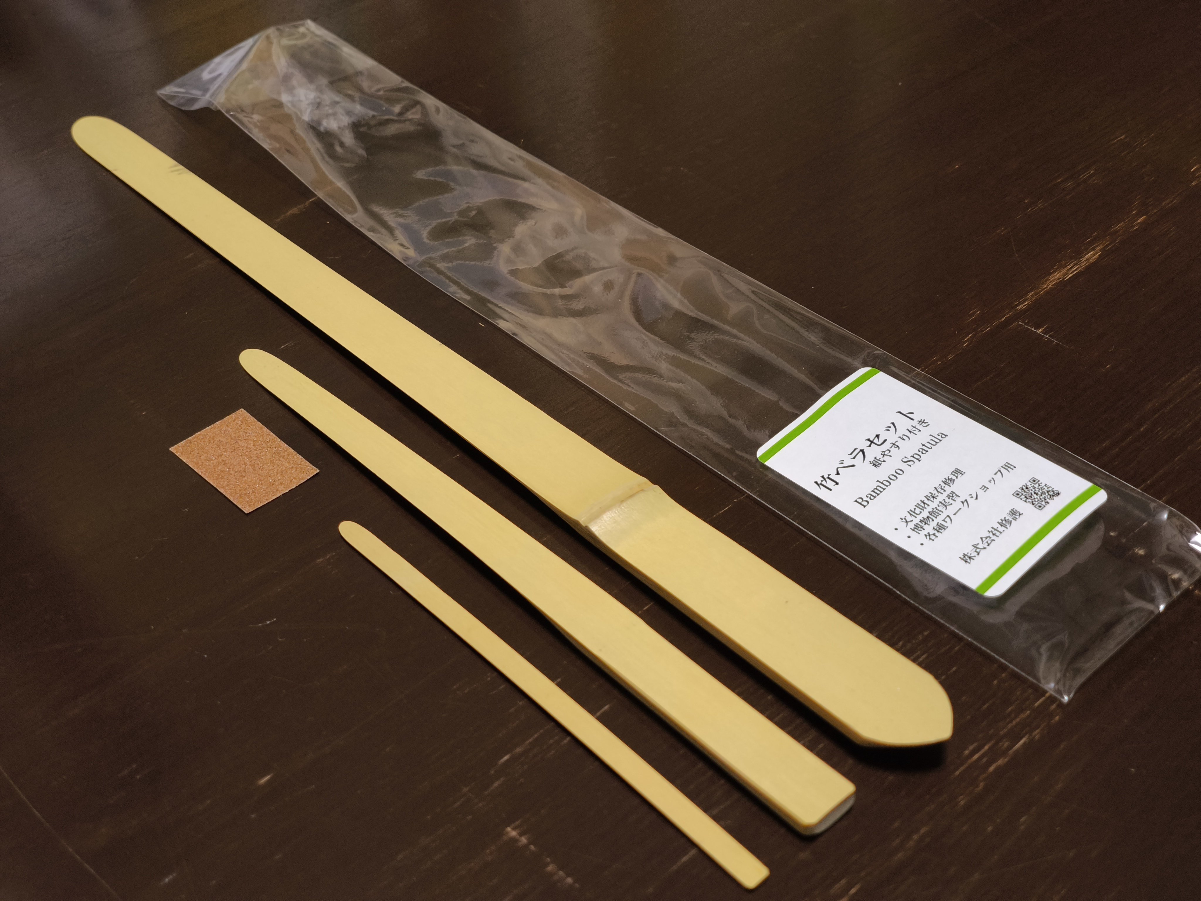 こうしたプロ仕様の道具は、学芸員など修理を専門としない方々からも求められることがあり、また、特に欧米では竹そのものの入手が難しいため、海外からのお問い合わせも増えておりました。しかしながら、竹を調達して一から削り出す工程は、現実的に困難な事情もございます。このような声にお応えし、文化財を安全に扱うための製品として「竹べらセット」を商品化いたしました。製作にあたっては、伝統工芸である竹細工を生業とする若手職人にご協力いただき、文化継承活動の一環として開発いたしました。 大・中・小の3本セットに調整用の紙ヤスリを同梱しており、ご自身の手に合うように最終調整もしていただける仕様です。お蔭様で、文化財関係者のみならず、図書館やアニメ制作会社様など多様な分野からもご好評をいただいています。