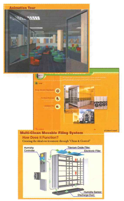 弊社採用のキーポイントは、棚内部の最適な保存環境と利用者の健康を考慮したハイパークリーンシステム、さらにAEXの基本的な操作性・安全性の優秀さにあったが、特に施主に対するプレゼンテーションでは、カラーコピーを駆使した専用本や備品配置後の図書館内部のイメージと、そこをウォークスルーできるCD-ROMを作成し、ハイパークリーンのメカニズムもアニメーションで判りやすく説明できた。
