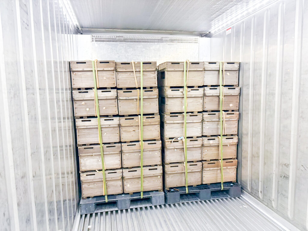 以前は、移動中に巣箱内の温度が上がらないよう、巣箱と巣箱の間に氷を置く等工夫していましたが、最近は温度管理ができる冷蔵車(保冷機能付きコンテナ)を使用しています。輸送途中でトラック庫内の様子を定期的に確認するなど、移動中の管理にも工夫を凝らしています。これにより、ミツバチへの負担が減り、管理がしやすくなりました。北海道での採蜜が終わったらすぐに熊本へ戻せるようになったのも大きなメリットです。