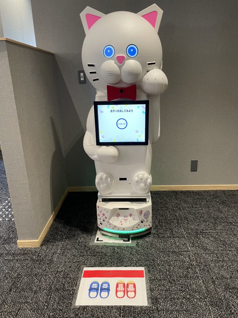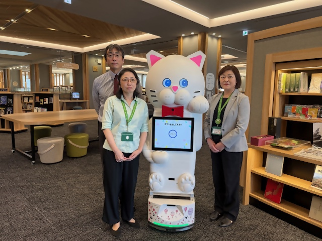 このロボットは蔵書点検だけではなく、コミュニケーション機能も搭載し、子どもたちと触れ合えるようにしました。開館時間中はネコ型ロボット”あおーニャ”として皆さんをお出迎えし、会話や写真撮影などができるようになっています。(首のリボン部分にカメラがあり、写真撮影後は二次元コードで画像の提供をしています)