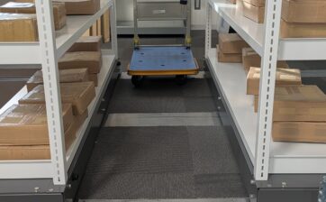 従来の移動棚にあった「レールの段差」をなくしたことで、台車作業がスムーズになります。