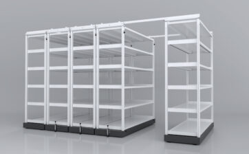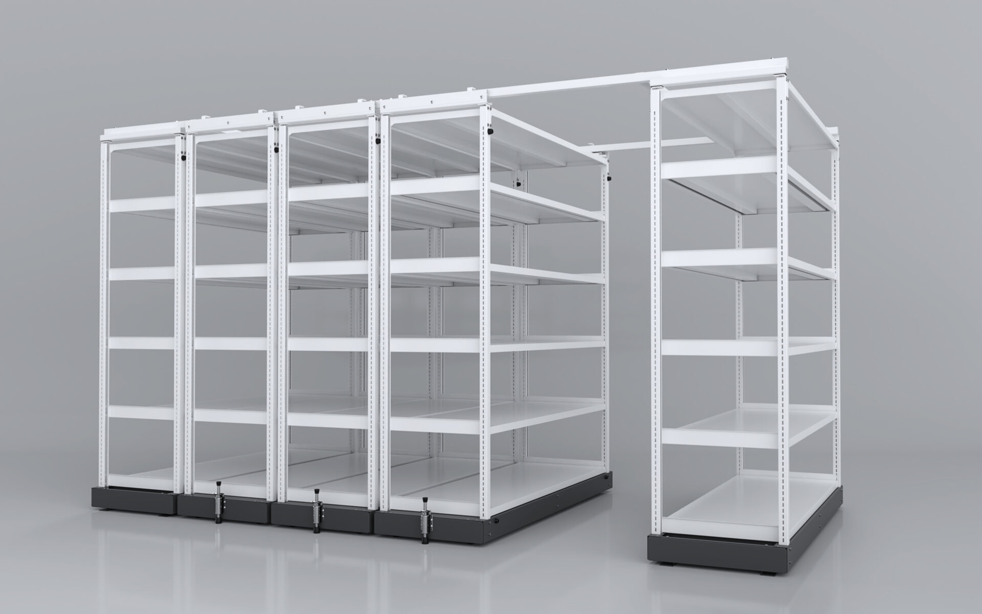 - 最大積載600kg: 可動棚1台あたり最大600kgまで積載可能(標準ナイロンキャスター仕様)。