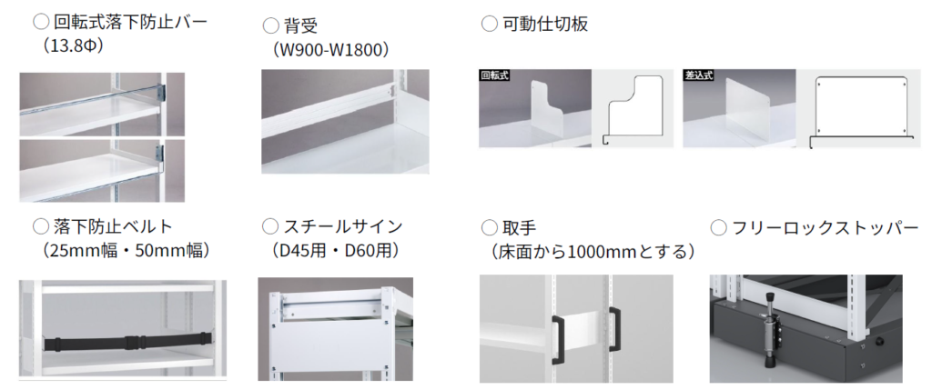 | ラック高さ | 6尺(H1831)・7尺(H2131) | ・別寸、別製の場合は別途相談ください ・高さは設置面より天板上面までの寸法 ・天板上面から上部転倒防止金具までは 106.2mm |