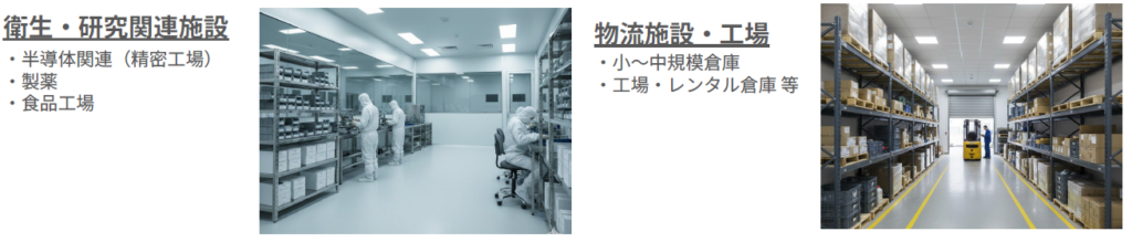 - レールレスのため⾞輪間に鉄粉‧ゴミ‧埃が溜まりにくく不陸の少ない半導体工場などやテナントなどへの設置にに適しています。