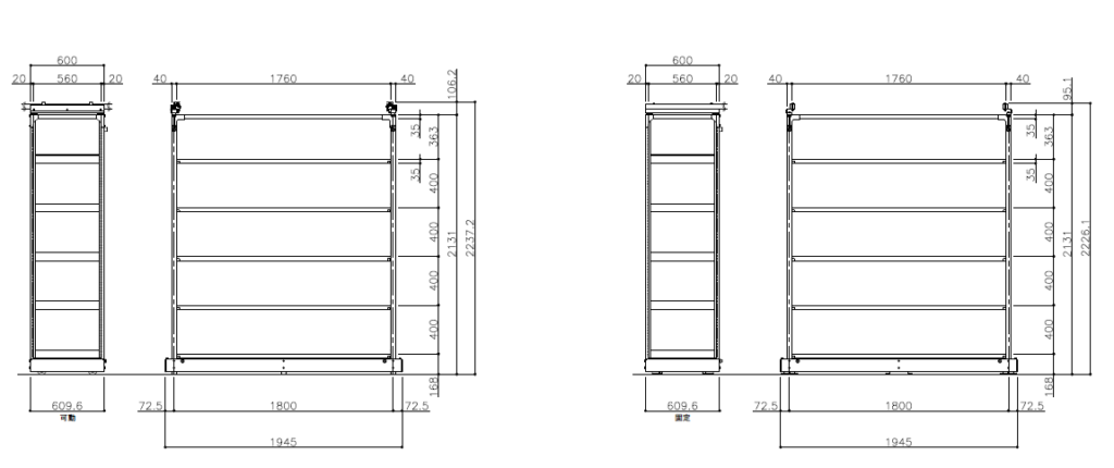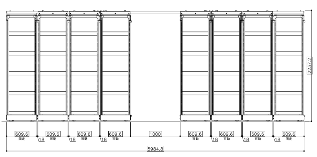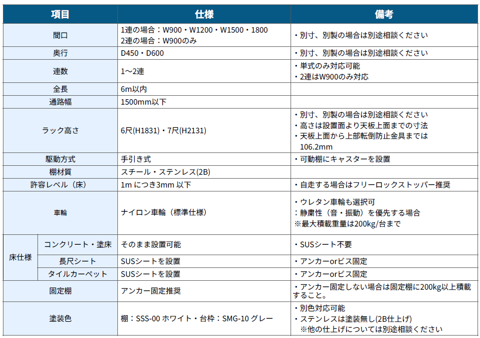 - 可動棚1台あたり最大600kg(標準ナイロンキャスター仕様)までの積載が可能です
