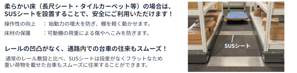 - 段差を乗り越える⼿間や衝撃もないため作業が捗ります。またレールの溝がないことで従来の移動棚よりゴミや埃が溜まりにくく空間を清潔に保てます。