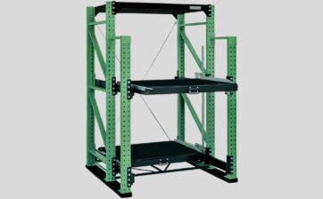 重量物を載せたままで棚が前後にスライドしますから倉庫や工場内の天井クレーンなどを使って重量物の出し入れが簡単に行えます。