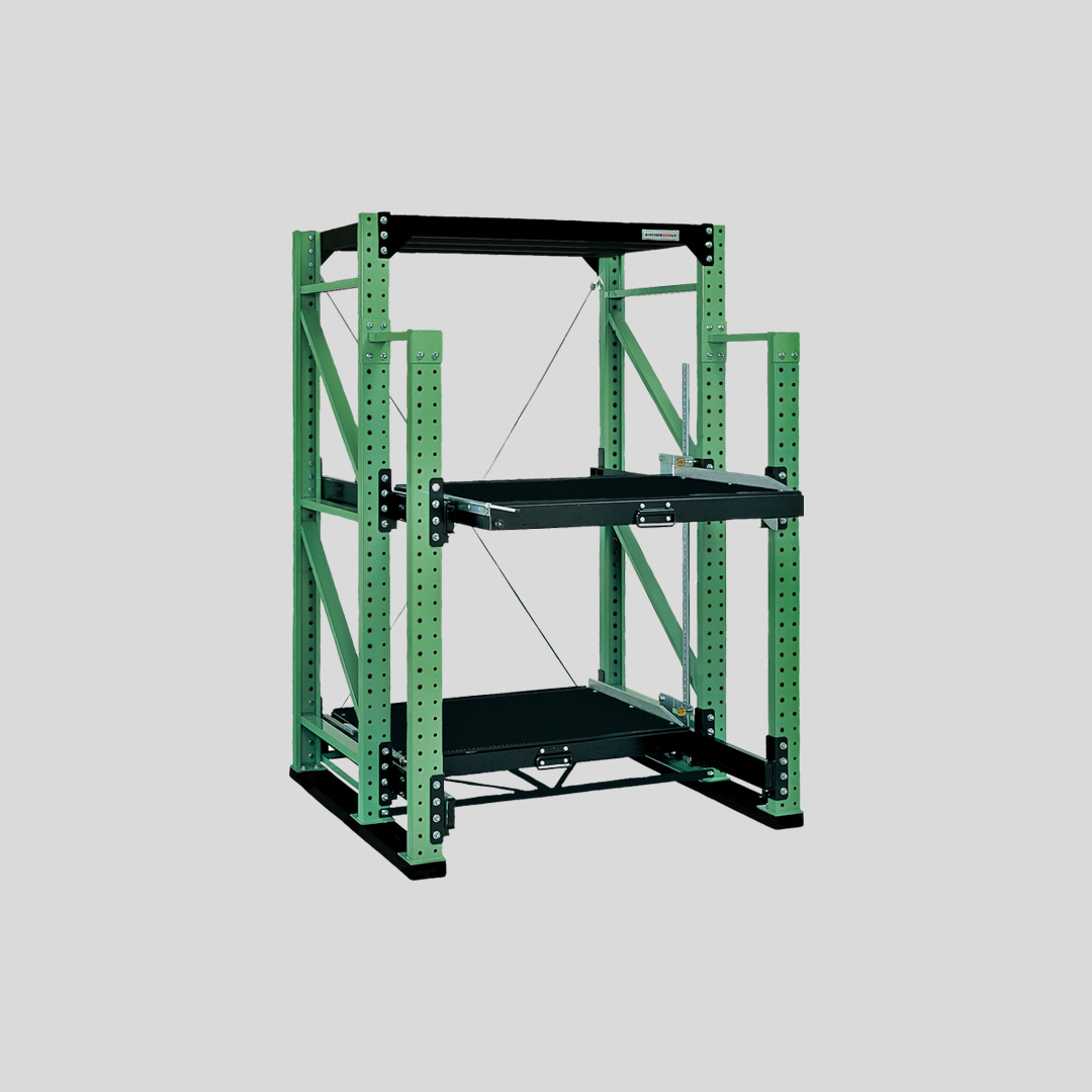 人の手だけでは動かせない重量物を載せたまま棚が前後にスライドするため、クレーン作業が容易になり、作業効率とスペース効率(立体保管)が大幅に向上します。