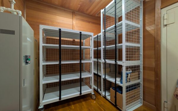 収蔵庫では資料への緩衝性を考慮し、木製棚や木製棚板が好まれますが、